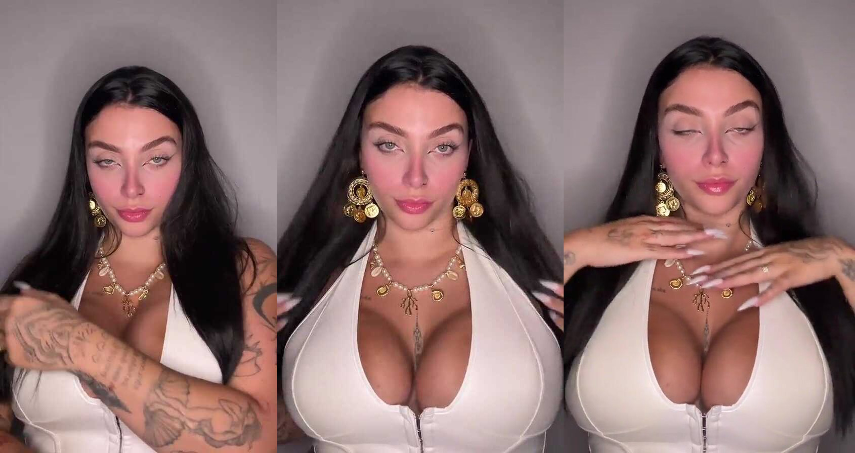 Description: Stef Gordinha flaunts her curves in a tight, white outfit that accentuates her deep cleavage. She poses seductively, showing off her tattoos and gold jewelry. Her long hair and sultry expressions add to the allure. Watch her tease and tantalize in this steamy video.