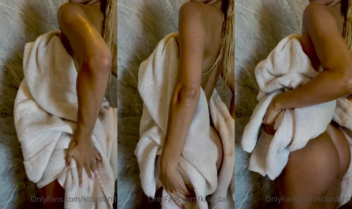 Blonde bombshell ktlordahl teases in a towel, wet from the shower, her breasts and buttocks playfully peeking out in this steamy bathroom scene. OnlyFans exclusive, pure temptation.