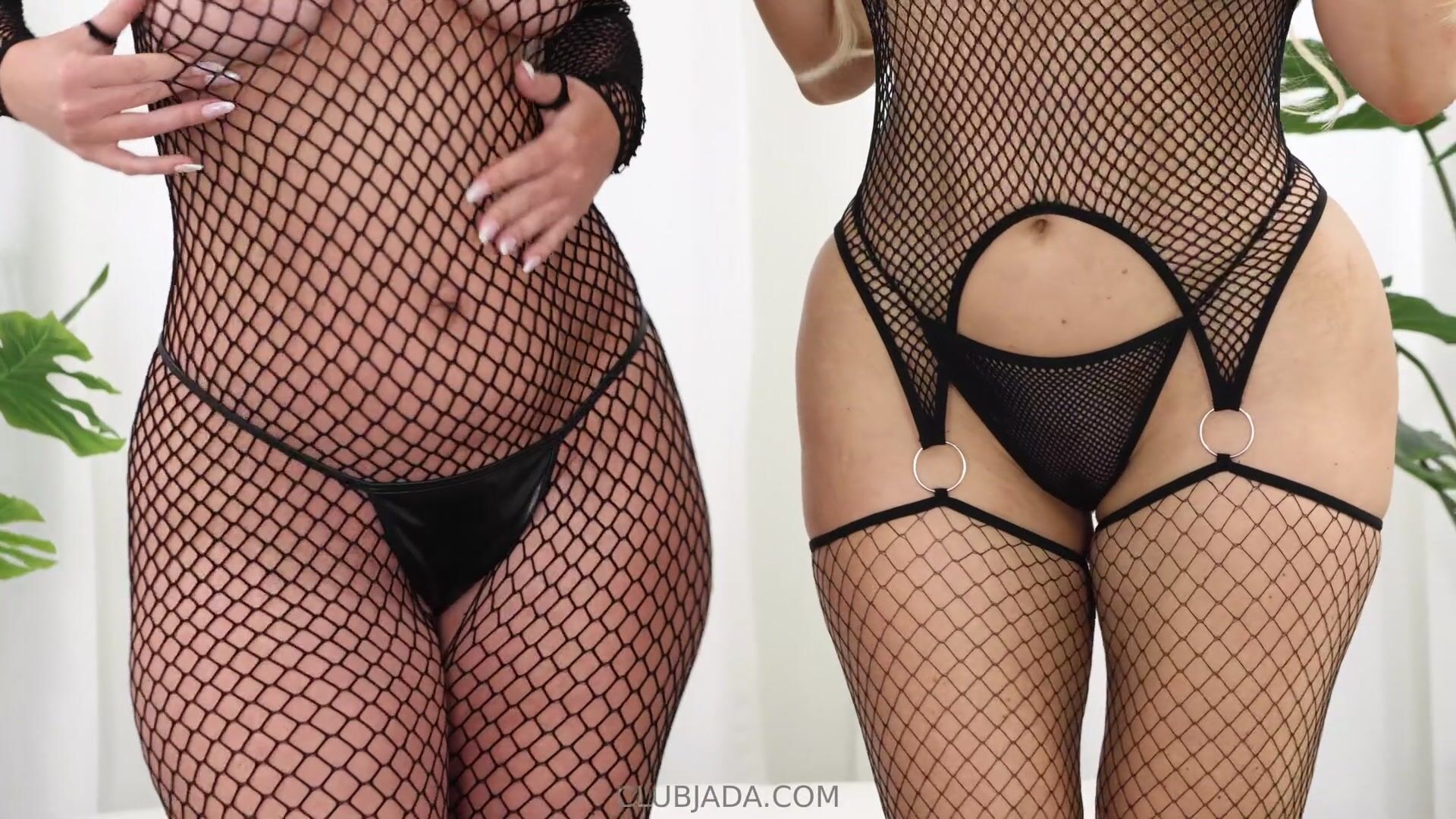 Curvy Goddess Jada Stevens teases in see-through fishnet bodysuit showing off her pussy and thick thighs in this seductive video