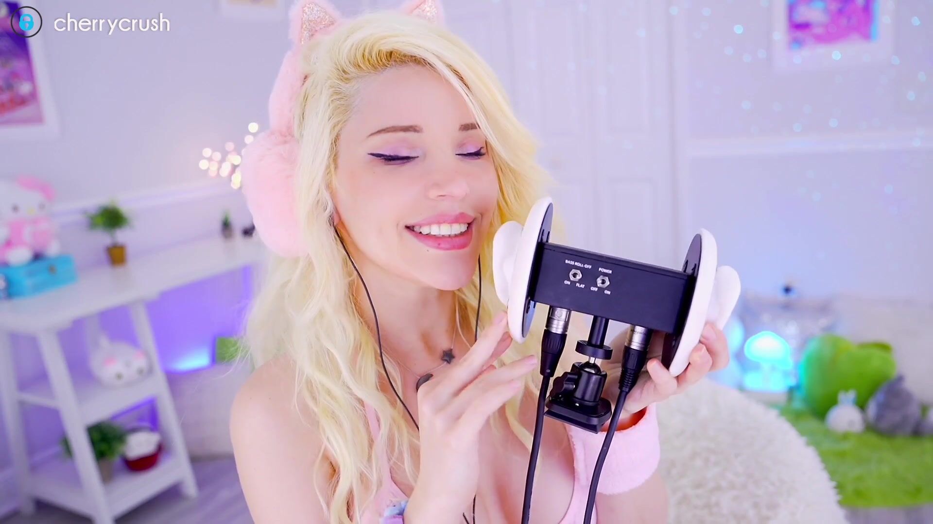 Description: Blonde babe Cherrycrush brings you into her whimsical world with ASMR sounds and playing in cute pink lingerie and kitty ears.