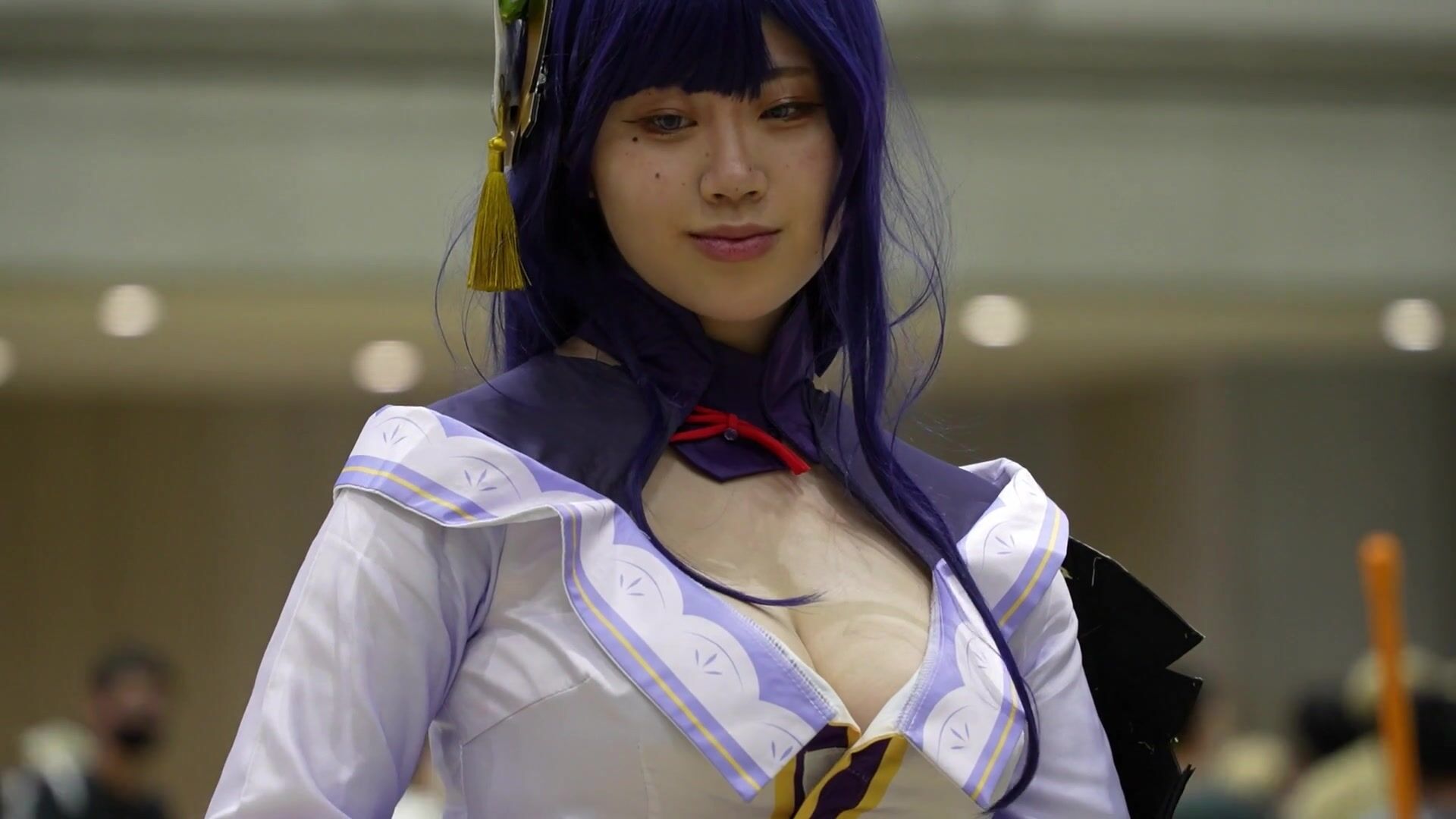 Petite Asian cutie in full cosplay teases her big tits and juicy ass in this candid-style video