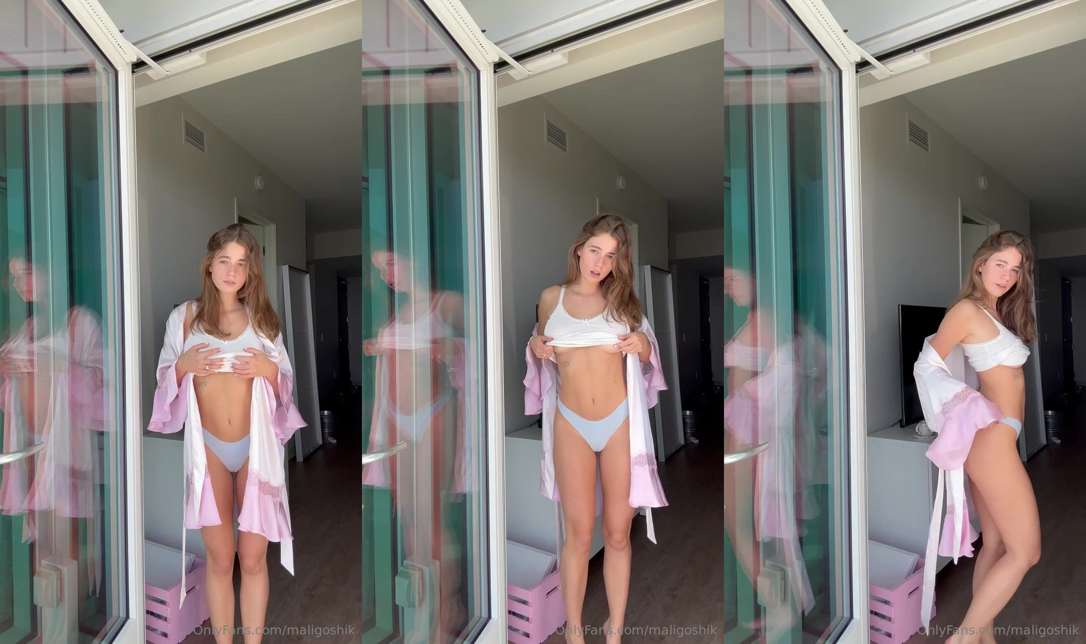 A seductive video where maligoshik teases in blue lingerie, slowly revealing her curves in a private bedroom setting.