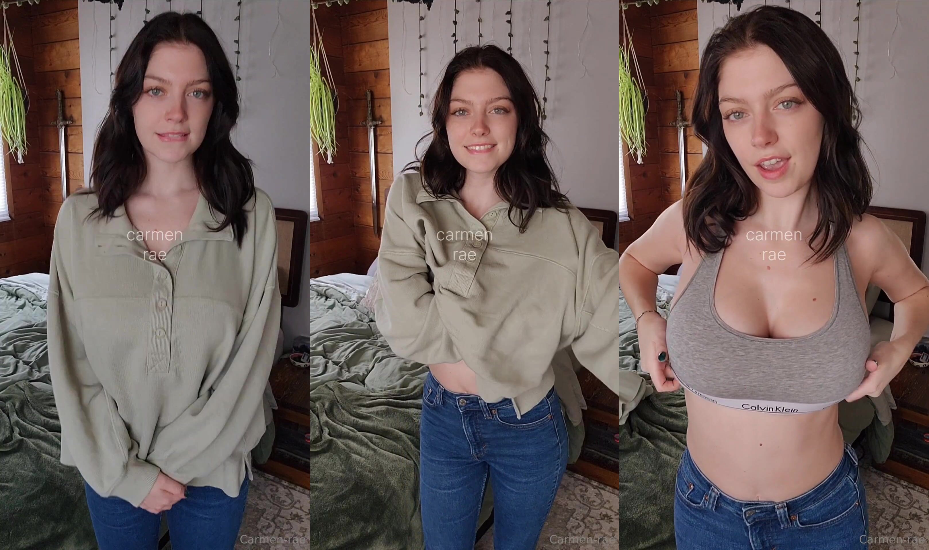 A sultry strip from Carmen-rae in her cozy bedroom as she reveals her Calvin Klein bra.
