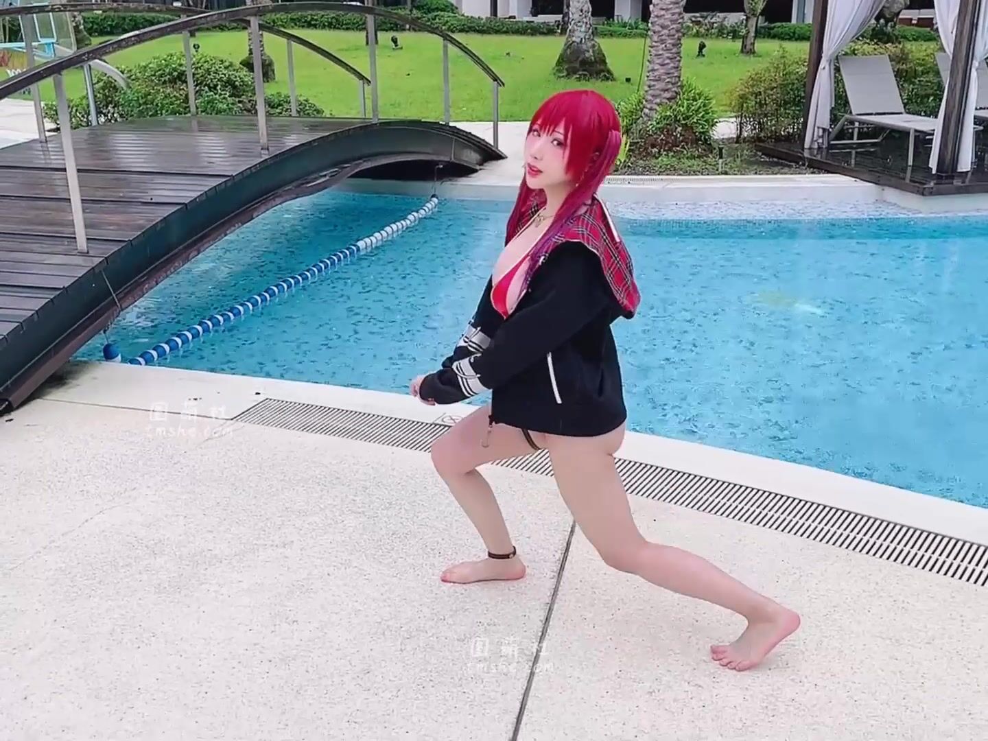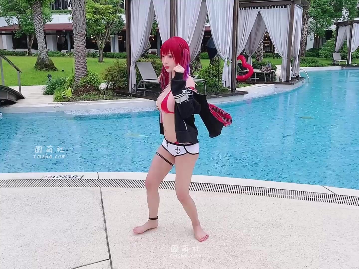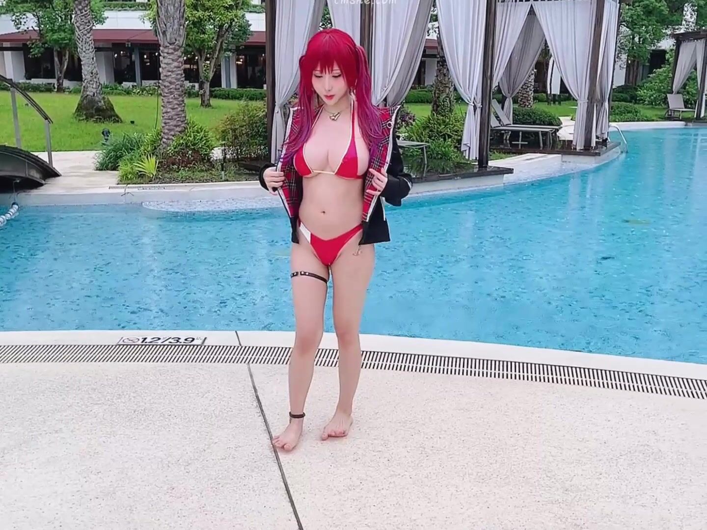 Petite Cutie Haneame__v4 teases in a red bikini and cosplay outfit, showing off her boobs in this poolside video