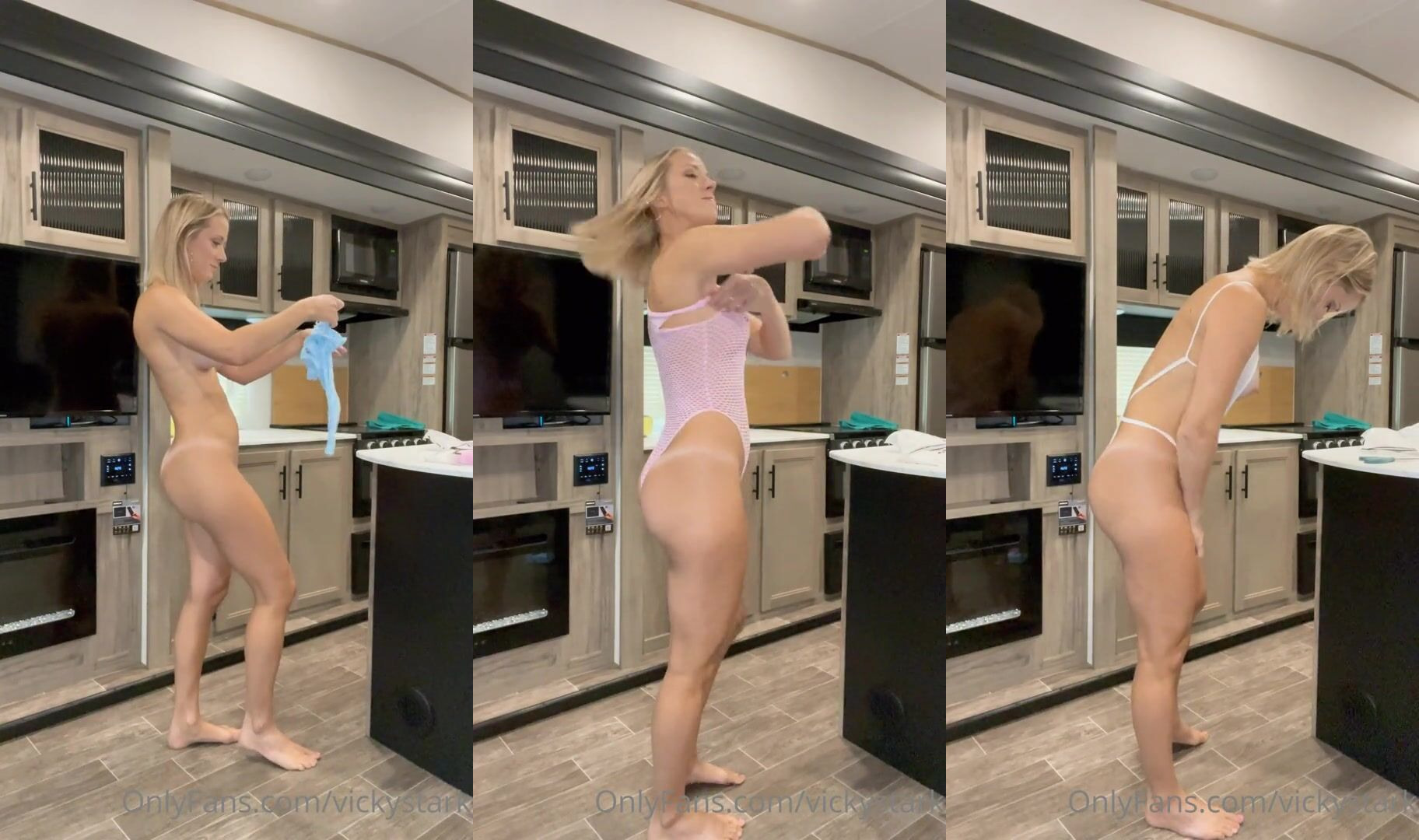 Blonde babe VickyStark shows off her curves in sheer lingerie and thong in this seductive try-on video, perfect for fans of lingerie tease.