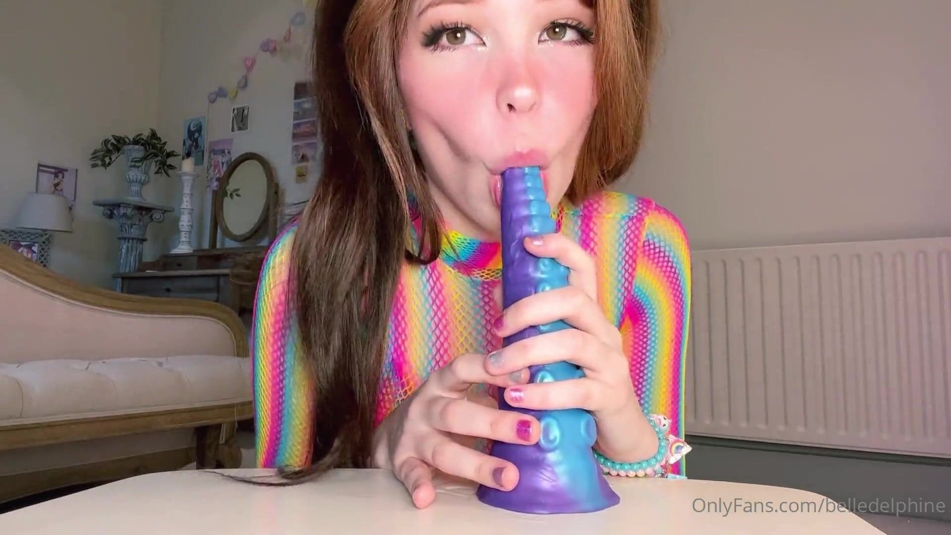 Belle Delphine Deepthroating Alien Dildo in Rainbow Fishnet Top OnlyFans Video